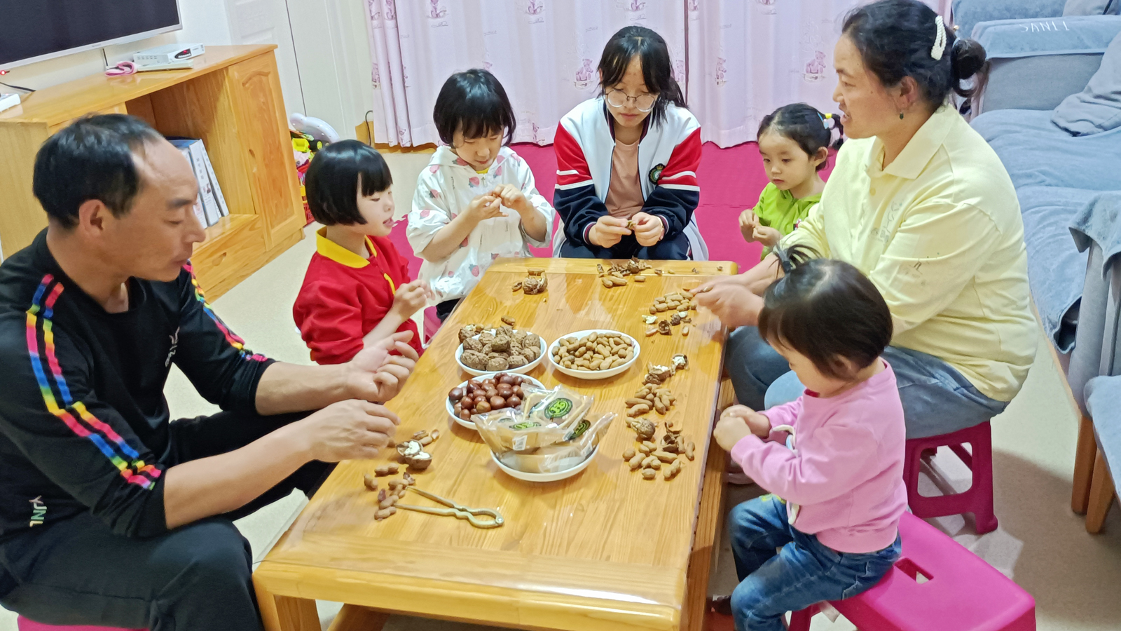 Nodding their heads in understanding, the children began eating the snacks from the golden harvest season, relishing in the festive atmosphere permeating their hearts and home.